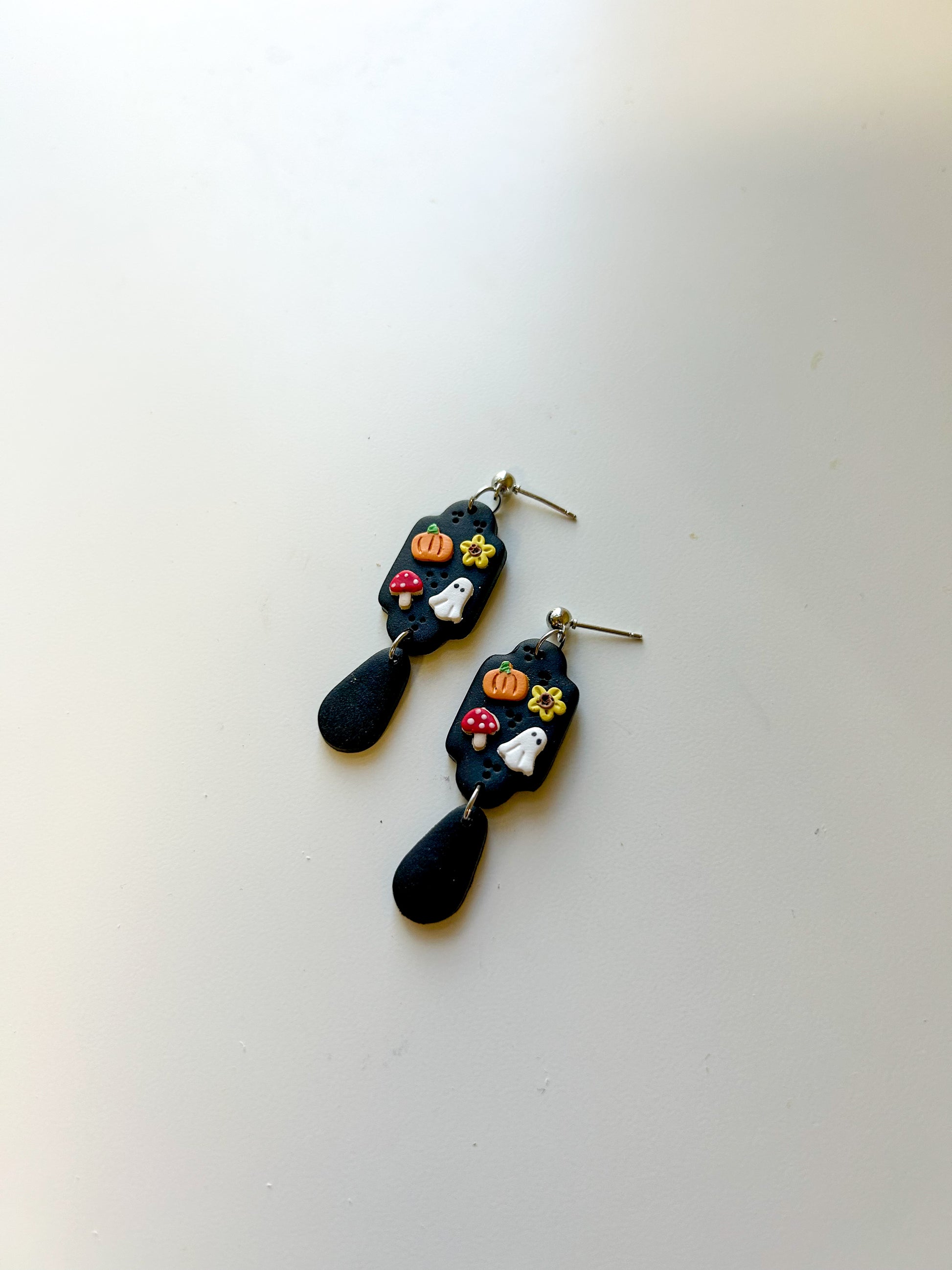 Hand mixed colors. Cut and assembled by hand. Hypoallergenic gold plated stainless steel posts. Hand painted details.